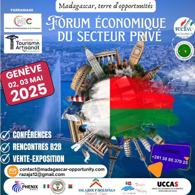 La Fédération des Chambres de Commerce et d’Industrie de Madagascar (FCCIM), en partenariat avec la Chambre de Commerce et d’Industrie Genève-Antananarivo (CCIGA), organise un forum économique dédié au secteur privé intitulé « Madagascar, terre d’opportunités », qui se tiendra à Genève les 02 et 03 mai 2025.